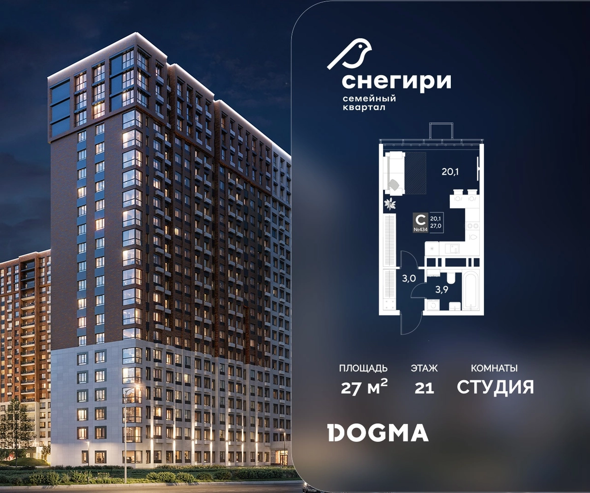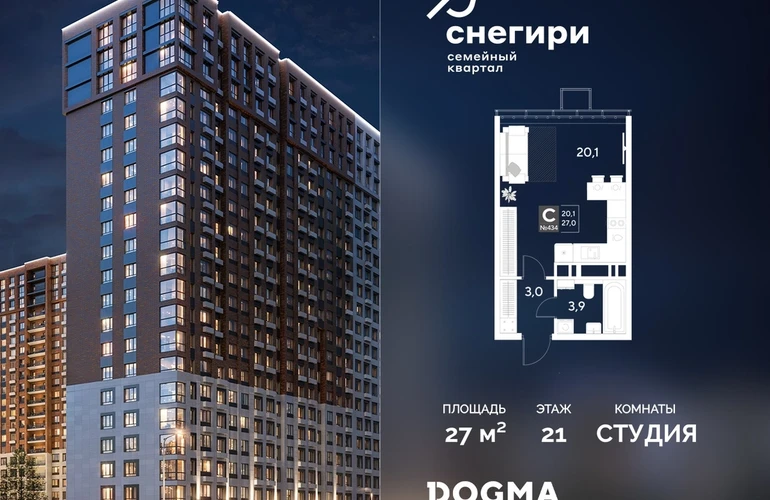 В продаже Студия от застройщика DOGMA! ЖК «Снегири», г. Омск, Литер 1 Срок сдачи: (4 кв. 2027, общей площадью 27 кв.м., на 21 этаже.) Район для счастливой жизни«Снегири» — это семейный квартал, который дарит радость простых вещей: тепло дома, безопасность и живую природу рядом.
