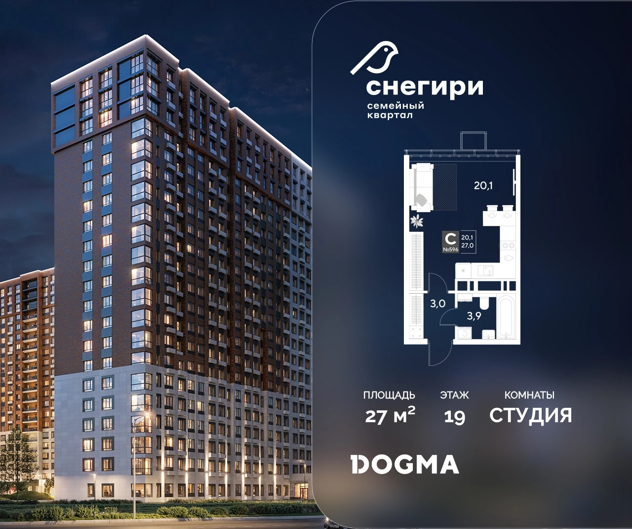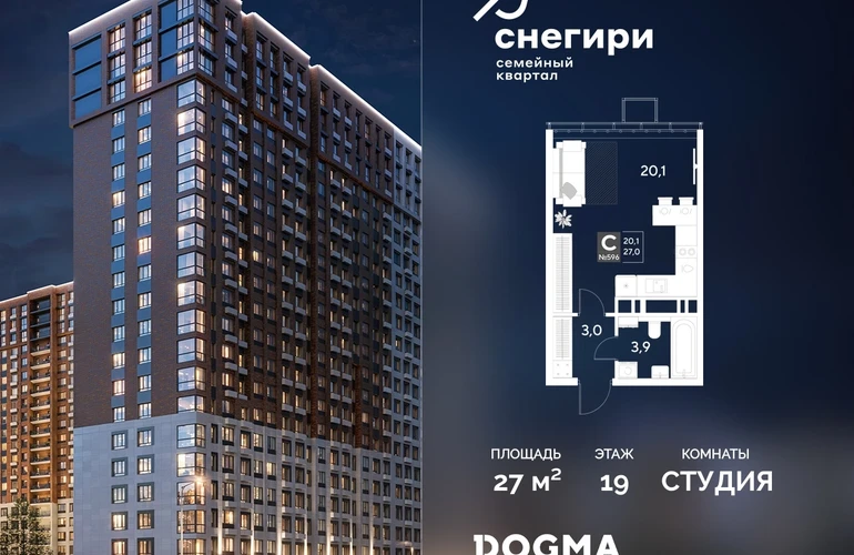 В продаже Студия от застройщика DOGMA! ЖК «Снегири», г. Омск, Литер 1 Срок сдачи: (4 кв. 2027, общей площадью 27 кв.м., на 19 этаже.) Район для счастливой жизни