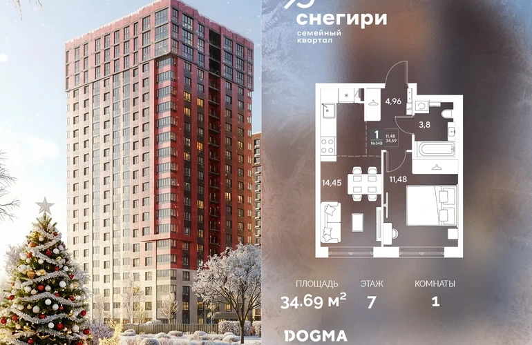 В продаже 1-комнатная квартира от застройщика DOGMA! ЖК «Снегири», г. Омск, Литер 3 Срок сдачи: (3 кв. 2029, общей площадью 34.69 кв.м., на 7 этаже.) Район для счастливой жизни