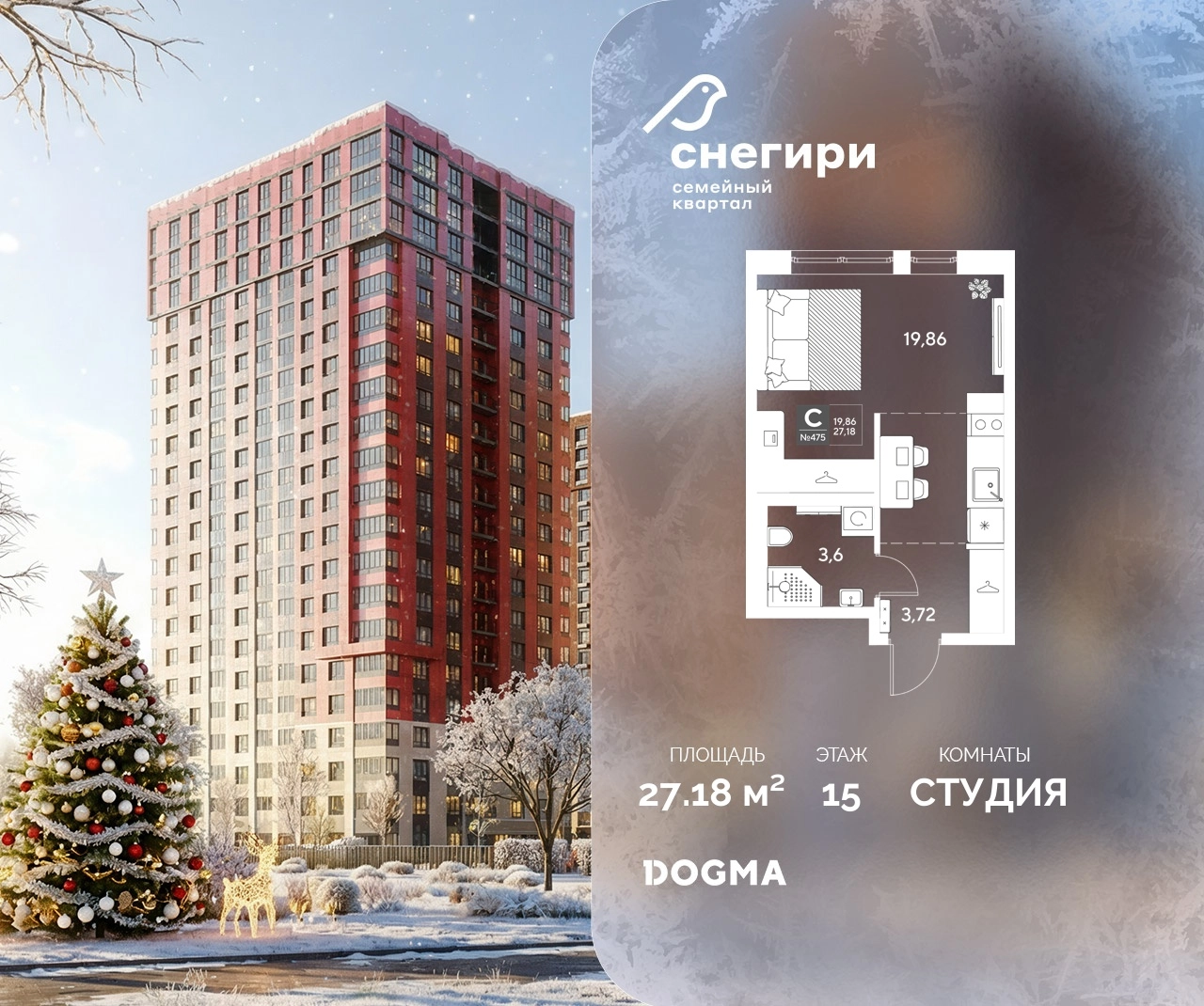 В продаже Студия от застройщика DOGMA! ЖК «Снегири», г. Омск, Литер 3 Срок сдачи: (3 кв. 2029, общей площадью 27.18 кв.м., на 15 этаже.) Район для счастливой жизни«Снегири» — это семейный квартал, который дарит радость простых вещей: тепло дома, безопасность и живую природу рядом.