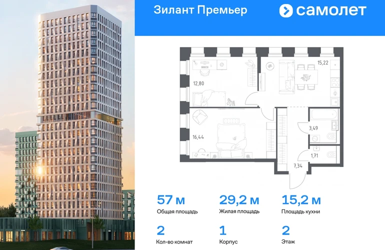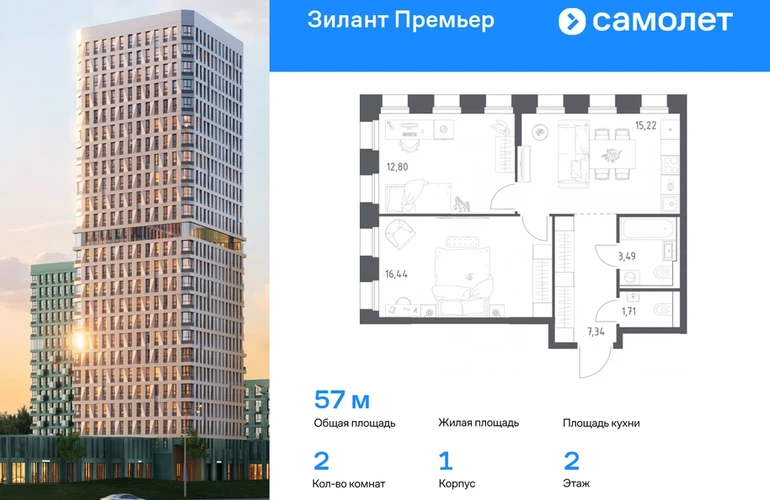Строим кварталы для жизни с заботой о будущем. Предлагается 2-комнатная квартира комфорт-класса 57 кв.м в корпусе 1 на 2 этаже, в ЖК «Зилант Премьер» Квартира с предчистовой отделкой. Доступность дополнительных опций уточняйте у застройщика. Приобрести квартиру возможно по специальным акциям от застройщика, с текущими условиями акций можно ознакомиться в блоке «Акций». Цена динамическая и может отличаться, уточняйте актуальность у застройщика. Жилой комплекс «Зилант Премьер» расположен в молодом районе города. До кремля — 20 минут на авто. В получасе пешком — метро «Горки». Рядом Горкинско-Ометьевский лес, 3 школы, 2 детских сада и поликлиника, скоро откроется свой детский сад. Дома высотой от 1 до 25 этажей с фасадами, которые оживляют открытые французские балконы. В уютном дворе — детские площадки и воркаут-зона.#yan19-2r1770133#О застройщике