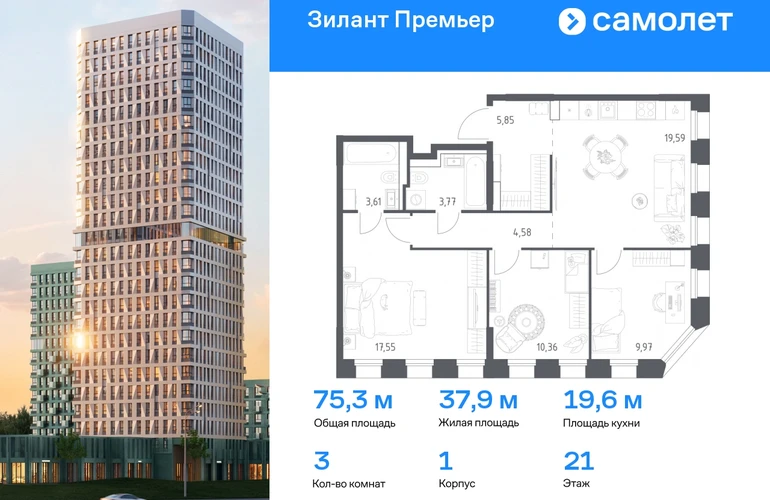Строим кварталы для жизни с заботой о будущем. Предлагается 3-комнатная квартира комфорт-класса 75,28 кв.м в корпусе 1 на 21 этаже, в ЖК «Зилант Премьер» Квартира с предчистовой отделкой. Доступность дополнительных опций уточняйте у застройщика. Приобрести квартиру возможно по специальным акциям от застройщика, с текущими условиями акций можно ознакомиться в блоке «Акций». Цена динамическая и может отличаться, уточняйте актуальность у застройщика. Жилой комплекс «Зилант Премьер» расположен в молодом районе города. До кремля — 20 минут на авто. В получасе пешком — метро «Горки». Рядом Горкинско-Ометьевский лес, 3 школы, 2 детских сада и поликлиника, скоро откроется свой детский сад. Дома высотой от 1 до 25 этажей с фасадами, которые оживляют открытые французские балконы. В уютном дворе — детские площадки и воркаут-зона.#yan19-2r1792017#О застройщике