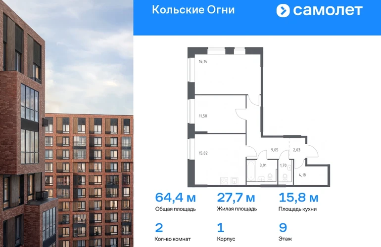 Строим кварталы для жизни с заботой о будущем. Предлагается 2-комнатная квартира комфорт-класса 64,41 кв.м в корпусе 1 на 9 этаже, в ЖК «Кольские Огни» Квартира без отделки. Доступность опции «отделка» и возможность комплектации мебелью и декором уточняйте у застройщика. Приобрести квартиру возможно по специальным акциям от застройщика, с текущими условиями акций можно ознакомиться в блоке «Акций». Цена динамическая и может отличаться, уточняйте актуальность у застройщика. Жилой комплекс «Кольские Огни» будет построен в Мурманской области, в городе Кола. Путь до центра Мурманска будет быстрым — всего 25 минут на машине. Рядом — Поморская набережная, парк, тундровый сад и лес всего в 10 минутах пешком. На первых этажах домов откроются кофейни и магазины, фитнес-зал и салон красоты, аптека, пункты выдачи заказов. Рядом с жилым комплексом работают детский сад, спортивная школа с бассейном и ФОК. Во дворе — озеленение, спортивные площадки, ремонт велосипедов, догхабы. Еще на территории квартала построим паркинг с зарядкой для электромобилей. Корпуса высотой 9–12 этажей и 14–17-этажные башни украшают деревянные панели. На входе в подъезды не будет ступеней и высоких порогов. После прогулки велосипеды и коляски можно оставить в местах хранения. Продуманные планировки от небольших студий до просторных 4-комнатных квартир. Отделка на выбор: готовая, White Box или вариант без нее. Выбирайте варианты без отделки, если хотите реализовать собственные решения.#yan19-2r1673773#О застройщике