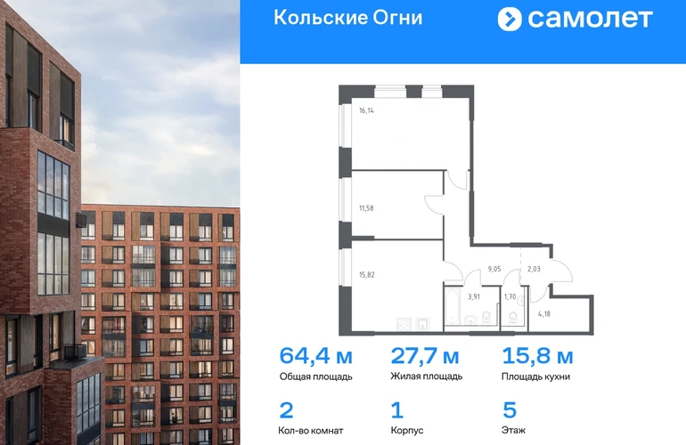 Строим кварталы для жизни с заботой о будущем. Предлагается 2-комнатная квартира комфорт-класса 64,41 кв.м в корпусе 1 на 5 этаже, в ЖК «Кольские Огни» Квартира без отделки. Доступность опции «отделка» и возможность комплектации мебелью и декором уточняйте у застройщика. Приобрести квартиру возможно по специальным акциям от застройщика, с текущими условиями акций можно ознакомиться в блоке «Акций». Цена динамическая и может отличаться, уточняйте актуальность у застройщика. Жилой комплекс «Кольские Огни» будет построен в Мурманской области, в городе Кола. Путь до центра Мурманска будет быстрым — всего 25 минут на машине. Рядом — Поморская набережная, парк, тундровый сад и лес всего в 10 минутах пешком. На первых этажах домов откроются кофейни и магазины, фитнес-зал и салон красоты, аптека, пункты выдачи заказов. Рядом с жилым комплексом работают детский сад, спортивная школа с бассейном и ФОК. Во дворе — озеленение, спортивные площадки, ремонт велосипедов, догхабы. Еще на территории квартала построим паркинг с зарядкой для электромобилей. Корпуса высотой 9–12 этажей и 14–17-этажные башни украшают деревянные панели. На входе в подъезды не будет ступеней и высоких порогов. После прогулки велосипеды и коляски можно оставить в местах хранения. Продуманные планировки от небольших студий до просторных 4-комнатных квартир. Отделка на выбор: готовая, White Box или вариант без нее. Выбирайте варианты без отделки, если хотите реализовать собственные решения.#yan19-2r1687689#