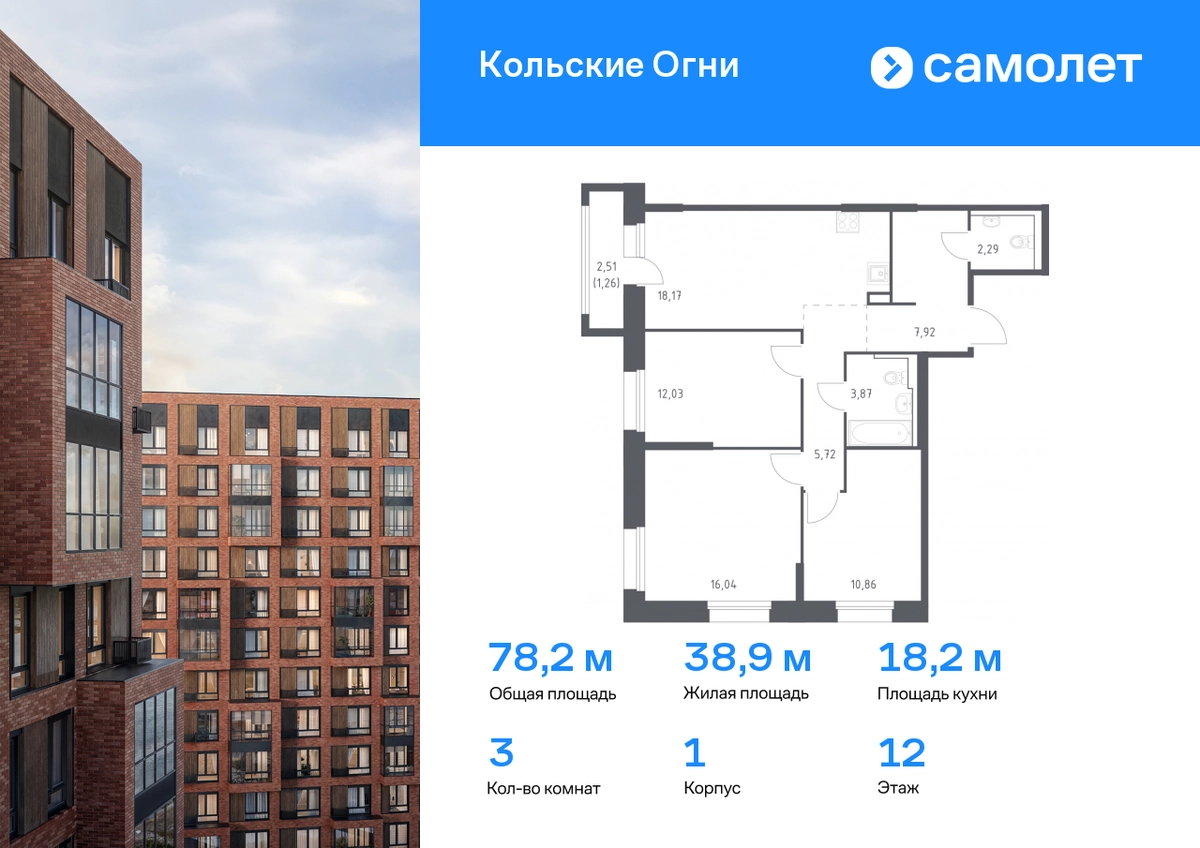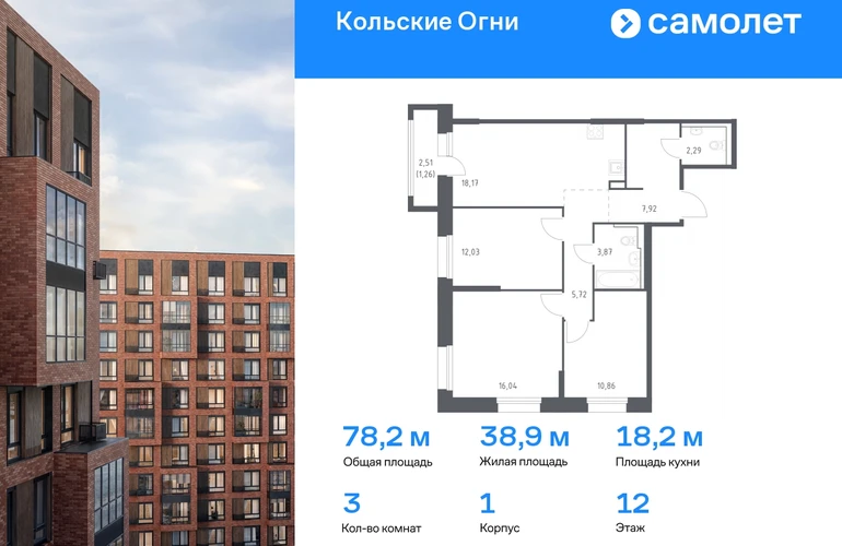 Строим кварталы для жизни с заботой о будущем. Предлагается 3-комнатная квартира комфорт-класса 78,16 кв.м в корпусе 1 на 12 этаже, в ЖК «Кольские Огни» Квартира без отделки. Доступность опции «отделка» и возможность комплектации мебелью и декором уточняйте у застройщика. Приобрести квартиру возможно по специальным акциям от застройщика, с текущими условиями акций можно ознакомиться в блоке «Акций». Цена динамическая и может отличаться, уточняйте актуальность у застройщика. Жилой комплекс «Кольские Огни» будет построен в Мурманской области, в городе Кола. Путь до центра Мурманска будет быстрым — всего 25 минут на машине. Рядом — Поморская набережная, парк, тундровый сад и лес всего в 10 минутах пешком. На первых этажах домов откроются кофейни и магазины, фитнес-зал и салон красоты, аптека, пункты выдачи заказов. Рядом с жилым комплексом работают детский сад, спортивная школа с бассейном и ФОК. Во дворе — озеленение, спортивные площадки, ремонт велосипедов, догхабы. Еще на территории квартала построим паркинг с зарядкой для электромобилей. Корпуса высотой 9–12 этажей и 14–17-этажные башни украшают деревянные панели. На входе в подъезды не будет ступеней и высоких порогов. После прогулки велосипеды и коляски можно оставить в местах хранения. Продуманные планировки от небольших студий до просторных 4-комнатных квартир. Отделка на выбор: готовая, White Box или вариант без нее. Выбирайте варианты без отделки, если хотите реализовать собственные решения.#yan19-2r1687700#