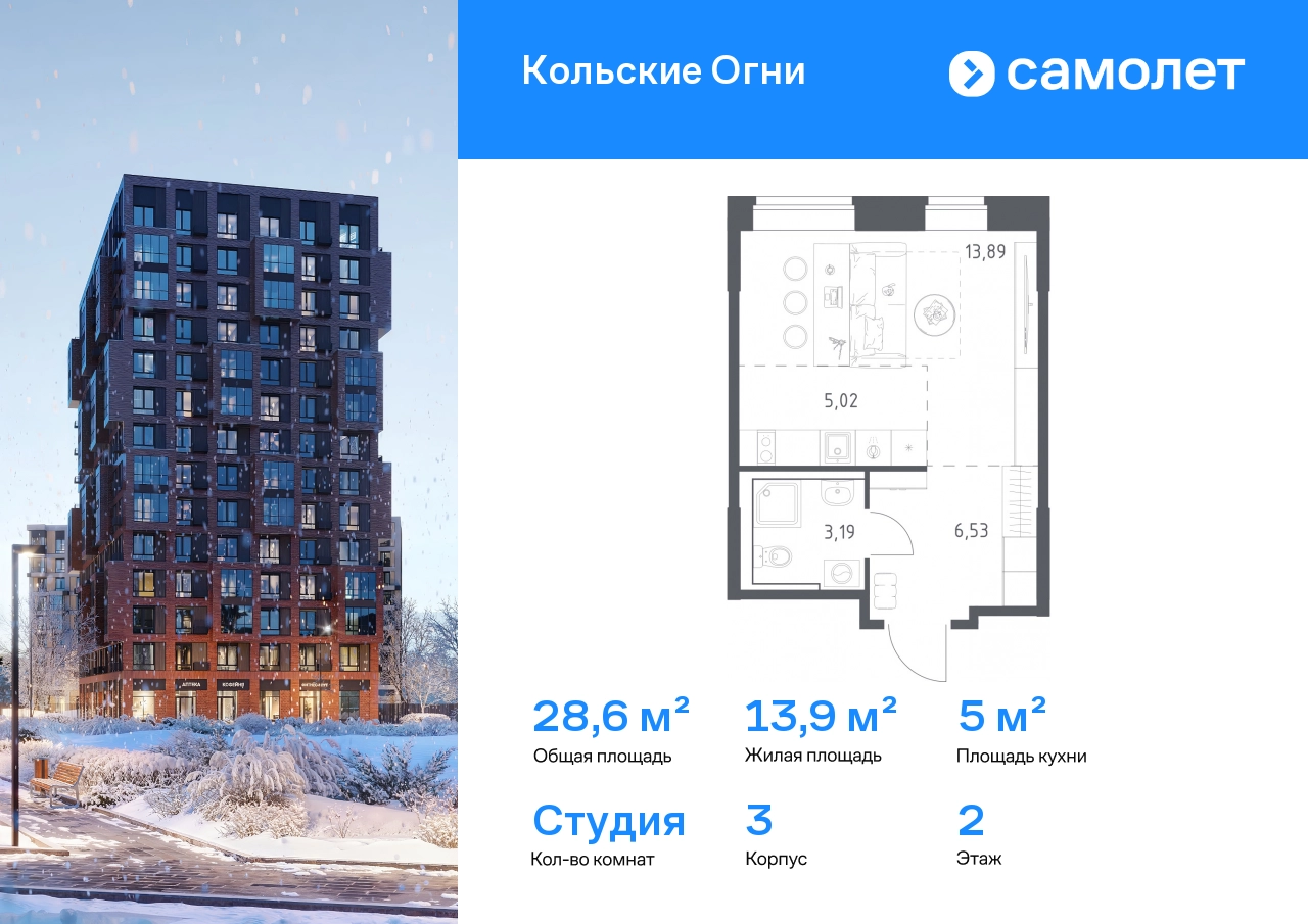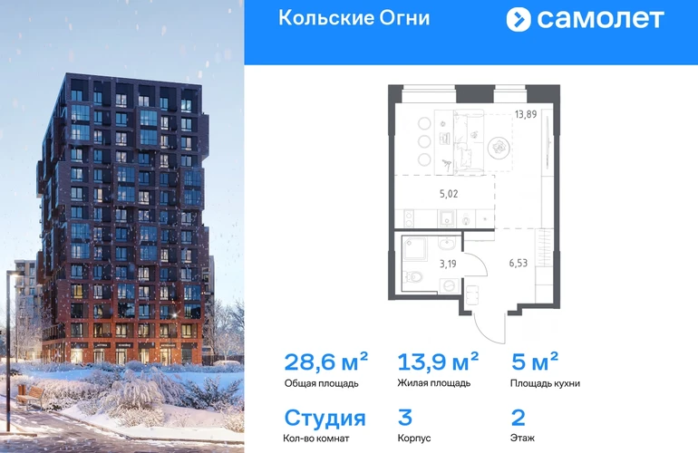 Строим кварталы для жизни с заботой о будущем. Предлагается квартира студия комфорт-класса 28,63 кв.м в корпусе 3 на 2 этаже, в ЖК «Кольские Огни» Квартира без отделки. Доступность опции «отделка» и возможность комплектации мебелью и декором уточняйте у застройщика. Приобрести квартиру возможно по специальным акциям от застройщика, с текущими условиями акций можно ознакомиться в блоке «Акций». Цена динамическая и может отличаться, уточняйте актуальность у застройщика. Жилой комплекс «Кольские Огни» будет построен в Мурманской области, в городе Кола. Путь до центра Мурманска будет быстрым — всего 25 минут на машине. Рядом — Поморская набережная, парк, тундровый сад и лес всего в 10 минутах пешком. На первых этажах домов откроются кофейни и магазины, фитнес-зал и салон красоты, аптека, пункты выдачи заказов. Рядом с жилым комплексом работают детский сад, спортивная школа с бассейном и ФОК. Во дворе — озеленение, спортивные площадки, ремонт велосипедов, догхабы. Еще на территории квартала построим паркинг с зарядкой для электромобилей. Корпуса высотой 9–12 этажей и 14–17-этажные башни украшают деревянные панели. На входе в подъезды не будет ступеней и высоких порогов. После прогулки велосипеды и коляски можно оставить в местах хранения. Продуманные планировки от небольших студий до просторных 4-комнатных квартир. Отделка на выбор: готовая, White Box или вариант без нее. Выбирайте варианты без отделки, если хотите реализовать собственные решения.#yan19-2r1784434#
