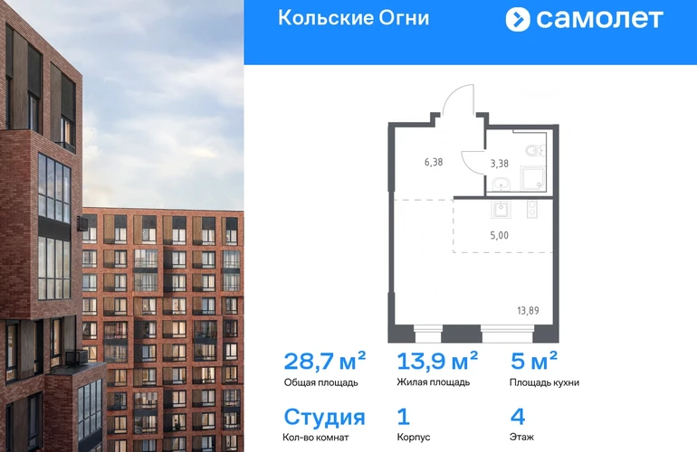 Строим кварталы для жизни с заботой о будущем. Предлагается квартира студия комфорт-класса 28,65 кв.м в корпусе 1 на 4 этаже, в ЖК «Кольские Огни» Квартира без отделки. Доступность опции «отделка» и возможность комплектации мебелью и декором уточняйте у застройщика. Приобрести квартиру возможно по специальным акциям от застройщика, с текущими условиями акций можно ознакомиться в блоке «Акций». Цена динамическая и может отличаться, уточняйте актуальность у застройщика. Жилой комплекс «Кольские Огни» будет построен в Мурманской области, в городе Кола. Путь до центра Мурманска будет быстрым — всего 25 минут на машине. Рядом — Поморская набережная, парк, тундровый сад и лес всего в 10 минутах пешком. На первых этажах домов откроются кофейни и магазины, фитнес-зал и салон красоты, аптека, пункты выдачи заказов. Рядом с жилым комплексом работают детский сад, спортивная школа с бассейном и ФОК. Во дворе — озеленение, спортивные площадки, ремонт велосипедов, догхабы. Еще на территории квартала построим паркинг с зарядкой для электромобилей. Корпуса высотой 9–12 этажей и 14–17-этажные башни украшают деревянные панели. На входе в подъезды не будет ступеней и высоких порогов. После прогулки велосипеды и коляски можно оставить в местах хранения. Продуманные планировки от небольших студий до просторных 4-комнатных квартир. Отделка на выбор: готовая, White Box или вариант без нее. Выбирайте варианты без отделки, если хотите реализовать собственные решения.#yan19-2r1812254#О застройщике