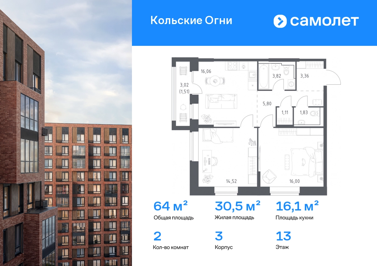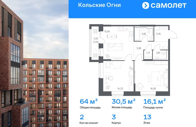 Строим кварталы для жизни с заботой о будущем. Предлагается 2-комнатная квартира комфорт-класса 64,01 кв.м в корпусе 3 на 13 этаже, в ЖК «Кольские Огни» Квартира без отделки. Доступность опции «отделка» и возможность комплектации мебелью и декором уточняйте у застройщика. Приобрести квартиру возможно по специальным акциям от застройщика, с текущими условиями акций можно ознакомиться в блоке «Акций». Цена динамическая и может отличаться, уточняйте актуальность у застройщика. Жилой комплекс «Кольские Огни» будет построен в Мурманской области, в городе Кола. Путь до центра Мурманска будет быстрым — всего 25 минут на машине. Рядом — Поморская набережная, парк, тундровый сад и лес всего в 10 минутах пешком. На первых этажах домов откроются кофейни и магазины, фитнес-зал и салон красоты, аптека, пункты выдачи заказов. Рядом с жилым комплексом работают детский сад, спортивная школа с бассейном и ФОК. Во дворе — озеленение, спортивные площадки, ремонт велосипедов, догхабы. Еще на территории квартала построим паркинг с зарядкой для электромобилей. Корпуса высотой 9–12 этажей и 14–17-этажные башни украшают деревянные панели. На входе в подъезды не будет ступеней и высоких порогов. После прогулки велосипеды и коляски можно оставить в местах хранения. Продуманные планировки от небольших студий до просторных 4-комнатных квартир. Отделка на выбор: готовая, White Box или вариант без нее. Выбирайте варианты без отделки, если хотите реализовать собственные решения.#yan19-2r1822844#О застройщике