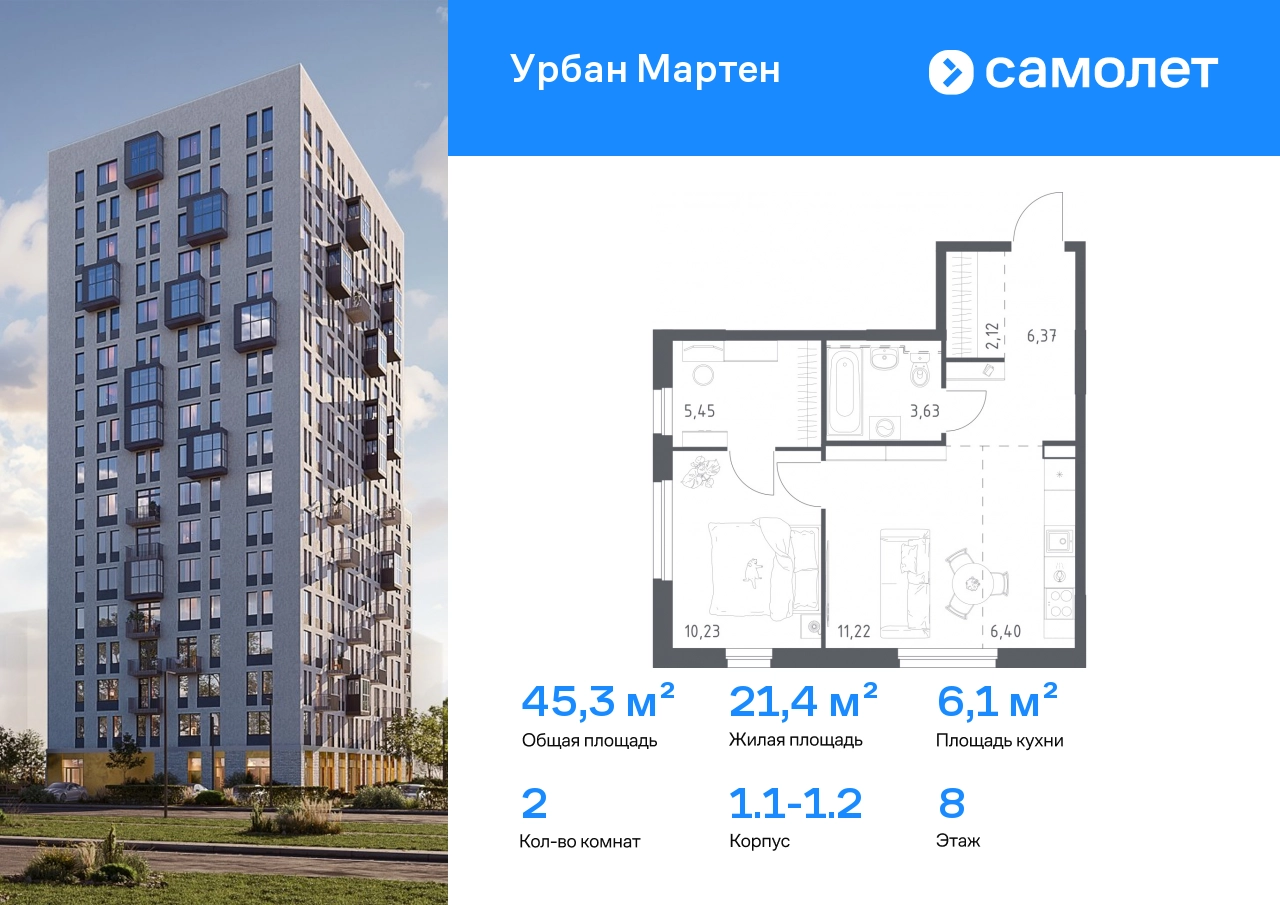 Строим кварталы для жизни с заботой о будущем. Предлагается 2-комнатная квартира комфорт-класса 45,42 кв.м в корпусе 1.1-1.2 на 8 этаже, в ЖК «Урбан Мартен» Квартира с предчистовой отделкой. Доступность дополнительных опций уточняйте у застройщика. Приобрести квартиру возможно по специальным акциям от застройщика, с текущими условиями акций можно ознакомиться в блоке «Акций». Цена динамическая и может отличаться, уточняйте актуальность у застройщика. В жилом комплексе «Урбан Мартен» у вас будет собственная Уфа: домашняя, неторопливая, теплая. Здесь дети будут играть во дворе без машин в догонялки, собака сможет бегать за палкой по пляжу, а с соседями получится встречаться не только у лифта, но и на утренних занятиях йогой на зеленой лужайке рядом с домом. Жилой комплекс «Урбан Мартен» находится в Демском районе — самом тихом и зеленом в Уфе. Здесь можно открывать окна нараспашку, чтобы квартира наполнялась свежим воздухом, и наблюдать с балкона, как покачиваются макушки деревьев. #yan19-2r1737154#О застройщике