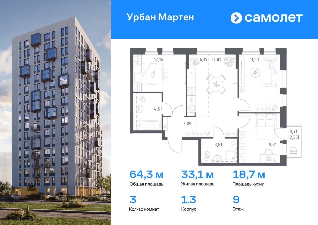 Строим кварталы для жизни с заботой о будущем. Предлагается 3-комнатная квартира комфорт-класса 64,56 кв.м в корпусе 1.3 на 9 этаже, в ЖК «Урбан Мартен» Квартира без отделки. Доступность опции «отделка» и возможность комплектации мебелью и декором уточняйте у застройщика. Приобрести квартиру возможно по специальным акциям от застройщика, с текущими условиями акций можно ознакомиться в блоке «Акций». Цена динамическая и может отличаться, уточняйте актуальность у застройщика. В жилом комплексе «Урбан Мартен» у вас будет собственная Уфа: домашняя, неторопливая, теплая. Здесь дети будут играть во дворе без машин в догонялки, собака сможет бегать за палкой по пляжу, а с соседями получится встречаться не только у лифта, но и на утренних занятиях йогой на зеленой лужайке рядом с домом. Жилой комплекс «Урбан Мартен» находится в Демском районе — самом тихом и зеленом в Уфе. Здесь можно открывать окна нараспашку, чтобы квартира наполнялась свежим воздухом, и наблюдать с балкона, как покачиваются макушки деревьев. #yan19-2r1806012#О застройщике