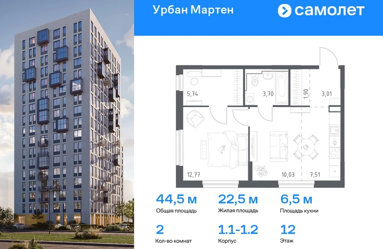Строим кварталы для жизни с заботой о будущем. Предлагается 2-комнатная квартира комфорт-класса 44,66 кв.м в корпусе 1.1-1.2 на 12 этаже, в ЖК «Урбан Мартен» Квартира с чистовой отделкой. Доступность дополнительных опций уточняйте у застройщика. Приобрести квартиру возможно по специальным акциям от застройщика, с текущими условиями акций можно ознакомиться в блоке «Акций». Цена динамическая и может отличаться, уточняйте актуальность у застройщика. В жилом комплексе «Урбан Мартен» у вас будет собственная Уфа: домашняя, неторопливая, теплая. Здесь дети будут играть во дворе без машин в догонялки, собака сможет бегать за палкой по пляжу, а с соседями получится встречаться не только у лифта, но и на утренних занятиях йогой на зеленой лужайке рядом с домом. Жилой комплекс «Урбан Мартен» находится в Демском районе — самом тихом и зеленом в Уфе. Здесь можно открывать окна нараспашку, чтобы квартира наполнялась свежим воздухом, и наблюдать с балкона, как покачиваются макушки деревьев. #yan19-2r1810410#О застройщике