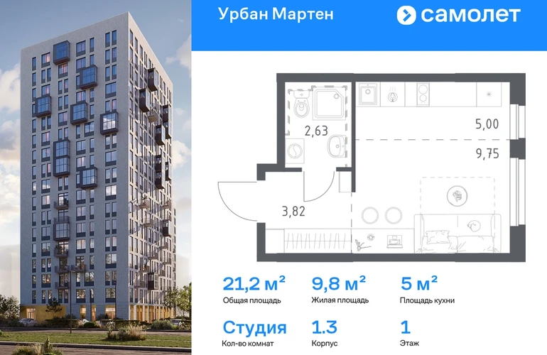 Строим кварталы для жизни с заботой о будущем. Предлагается квартира студия комфорт-класса 21,2 кв.м в корпусе 1.3 на 1 этаже, в ЖК «Урбан Мартен» Квартира с предчистовой отделкой. Доступность дополнительных опций уточняйте у застройщика. Приобрести квартиру возможно по специальным акциям от застройщика, с текущими условиями акций можно ознакомиться в блоке «Акций». Цена динамическая и может отличаться, уточняйте актуальность у застройщика. В жилом комплексе «Урбан Мартен» у вас будет собственная Уфа: домашняя, неторопливая, теплая. Здесь дети будут играть во дворе без машин в догонялки, собака сможет бегать за палкой по пляжу, а с соседями получится встречаться не только у лифта, но и на утренних занятиях йогой на зеленой лужайке рядом с домом. Жилой комплекс «Урбан Мартен» находится в Демском районе — самом тихом и зеленом в Уфе. Здесь можно открывать окна нараспашку, чтобы квартира наполнялась свежим воздухом, и наблюдать с балкона, как покачиваются макушки деревьев. #yan19-2r1814033#