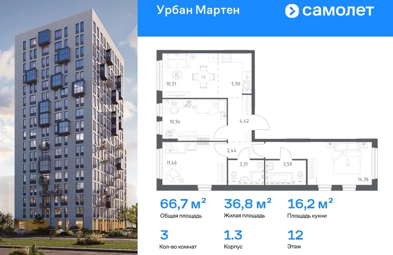 Строим кварталы для жизни с заботой о будущем. Предлагается 3-комнатная квартира комфорт-класса 66,73 кв.м в корпусе 1.3 на 12 этаже, в ЖК «Урбан Мартен» Квартира с предчистовой отделкой. Доступность дополнительных опций уточняйте у застройщика. Приобрести квартиру возможно по специальным акциям от застройщика, с текущими условиями акций можно ознакомиться в блоке «Акций». Цена динамическая и может отличаться, уточняйте актуальность у застройщика. В жилом комплексе «Урбан Мартен» у вас будет собственная Уфа: домашняя, неторопливая, теплая. Здесь дети будут играть во дворе без машин в догонялки, собака сможет бегать за палкой по пляжу, а с соседями получится встречаться не только у лифта, но и на утренних занятиях йогой на зеленой лужайке рядом с домом. Жилой комплекс «Урбан Мартен» находится в Демском районе — самом тихом и зеленом в Уфе. Здесь можно открывать окна нараспашку, чтобы квартира наполнялась свежим воздухом, и наблюдать с балкона, как покачиваются макушки деревьев. #yan19-2r1815981#О застройщике