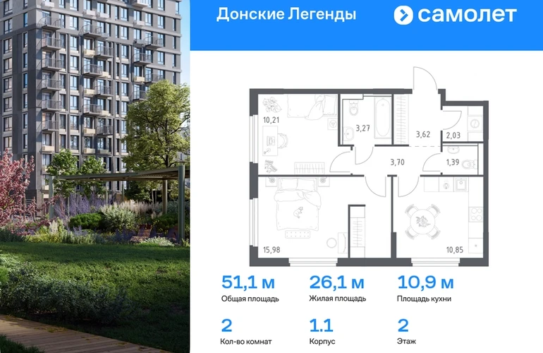 Строим кварталы для жизни с заботой о будущем. Предлагается 2-комнатная квартира комфорт-класса 51,05 кв.м в корпусе 1.1 на 2 этаже, в ЖК «Донские Легенды» Квартира без отделки. Доступность опции «отделка» и возможность комплектации мебелью и декором уточняйте у застройщика. Приобрести квартиру возможно по специальным акциям от застройщика, с текущими условиями акций можно ознакомиться в блоке «Акций». Цена динамическая и может отличаться, уточняйте актуальность у застройщика. Чувствовать гордость, когда любимая команда забивает гол, и с удовольствием спешить на тренировку по мини-футболу или теннису — так выглядит атмосфера в «Квартале Чехова» в Ленинском районе. Здесь каждый день станет ценным экспонатом в вашей коллекции впечатлений. Проект расположен рядом с Восточным шоссе и улицей Пойменной, всего в 10 минутах на машине от центра города. За 3 минуты вы доберетесь до Ворошиловского моста, а за 4 — до Темерницкого. Если не хотите ехать на машине, рядом остановки автобусов. Поблизости находится спортивный комплекс «Гребной канал Дон», а стадион «Ростов Арена» ждет любителей футбола. Прогуляться по благоустроенной набережной, повеселиться в аквапарке и подкрепиться мороженым можно в Левобережном парке — до него 5 минут на такси. Утро начнется с прогулки с малышом до одного из 3 детских садов. Рядом есть школа для ребят постарше, детская школа искусств, центр культурного развития и ФОК. В квартале откроются поликлиника со станцией скорой помощи и 2 торговых центра. Архитектура квартала сочетает современность и изящество. Элегантные французские балконы и панорамные окна позволят наслаждаться великолепными пейзажами. Во дворе дети играют на площадках, а взрослые занимаются спортом. У жителей будет собственный ипподром для соревнований по конкуру. А еще подземный и многоуровневые паркинги на 7,5 тысячи машино-мест. Входы в подъезды расположены на уровне земли, что удобно для родителей с колясками и путешественников. Для будущих жителей — квартиры без отделки. Можно реализовать любые дизайнерские идеи в своем новом доме.#yan19-2r1777230#О застройщике