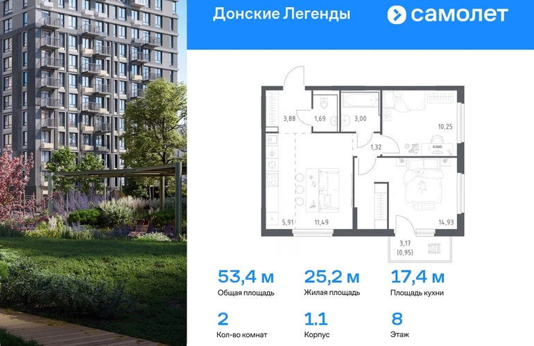 Строим кварталы для жизни с заботой о будущем. Предлагается 2-комнатная квартира комфорт-класса 53,42 кв.м в корпусе 1.1 на 8 этаже, в ЖК «Донские Легенды» Квартира без отделки. Доступность опции «отделка» и возможность комплектации мебелью и декором уточняйте у застройщика. Приобрести квартиру возможно по специальным акциям от застройщика, с текущими условиями акций можно ознакомиться в блоке «Акций». Цена динамическая и может отличаться, уточняйте актуальность у застройщика. Чувствовать гордость, когда любимая команда забивает гол, и с удовольствием спешить на тренировку по мини-футболу или теннису — так выглядит атмосфера в «Квартале Чехова» в Ленинском районе. Здесь каждый день станет ценным экспонатом в вашей коллекции впечатлений. Проект расположен рядом с Восточным шоссе и улицей Пойменной, всего в 10 минутах на машине от центра города. За 3 минуты вы доберетесь до Ворошиловского моста, а за 4 — до Темерницкого. Если не хотите ехать на машине, рядом остановки автобусов. Поблизости находится спортивный комплекс «Гребной канал Дон», а стадион «Ростов Арена» ждет любителей футбола. Прогуляться по благоустроенной набережной, повеселиться в аквапарке и подкрепиться мороженым можно в Левобережном парке — до него 5 минут на такси. Утро начнется с прогулки с малышом до одного из 3 детских садов. Рядом есть школа для ребят постарше, детская школа искусств, центр культурного развития и ФОК. В квартале откроются поликлиника со станцией скорой помощи и 2 торговых центра. Архитектура квартала сочетает современность и изящество. Элегантные французские балконы и панорамные окна позволят наслаждаться великолепными пейзажами. Во дворе дети играют на площадках, а взрослые занимаются спортом. У жителей будет собственный ипподром для соревнований по конкуру. А еще подземный и многоуровневые паркинги на 7,5 тысячи машино-мест. Входы в подъезды расположены на уровне земли, что удобно для родителей с колясками и путешественников. Для будущих жителей — квартиры без отделки. Можно реализовать любые дизайнерские идеи в своем новом доме.#yan19-2r1777237#О застройщике