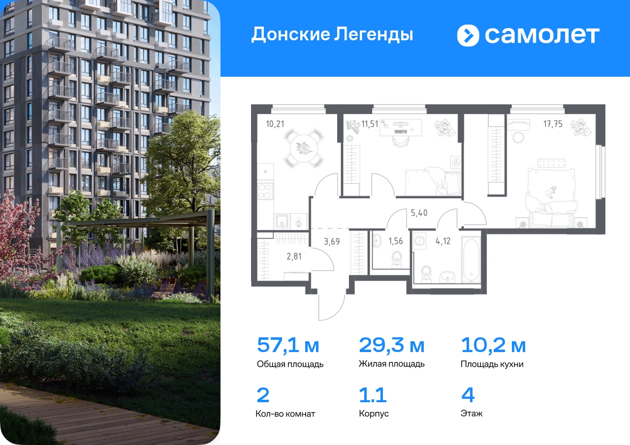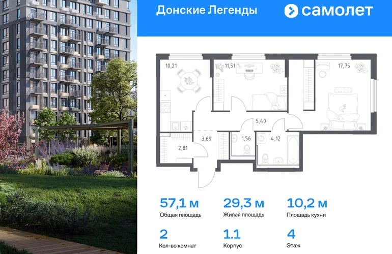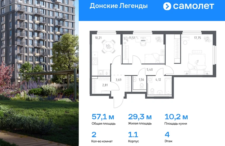 Строим кварталы для жизни с заботой о будущем. Предлагается 2-комнатная квартира комфорт-класса 57,05 кв.м в корпусе 1.1 на 4 этаже, в ЖК «Донские Легенды» Квартира без отделки. Доступность опции «отделка» и возможность комплектации мебелью и декором уточняйте у застройщика. Приобрести квартиру возможно по специальным акциям от застройщика, с текущими условиями акций можно ознакомиться в блоке «Акций». Цена динамическая и может отличаться, уточняйте актуальность у застройщика. Чувствовать гордость, когда любимая команда забивает гол, и с удовольствием спешить на тренировку по мини-футболу или теннису — так выглядит атмосфера в «Квартале Чехова» в Ленинском районе. Здесь каждый день станет ценным экспонатом в вашей коллекции впечатлений. Проект расположен рядом с Восточным шоссе и улицей Пойменной, всего в 10 минутах на машине от центра города. За 3 минуты вы доберетесь до Ворошиловского моста, а за 4 — до Темерницкого. Если не хотите ехать на машине, рядом остановки автобусов. Поблизости находится спортивный комплекс «Гребной канал Дон», а стадион «Ростов Арена» ждет любителей футбола. Прогуляться по благоустроенной набережной, повеселиться в аквапарке и подкрепиться мороженым можно в Левобережном парке — до него 5 минут на такси. Утро начнется с прогулки с малышом до одного из 3 детских садов. Рядом есть школа для ребят постарше, детская школа искусств, центр культурного развития и ФОК. В квартале откроются поликлиника со станцией скорой помощи и 2 торговых центра. Архитектура квартала сочетает современность и изящество. Элегантные французские балконы и панорамные окна позволят наслаждаться великолепными пейзажами. Во дворе дети играют на площадках, а взрослые занимаются спортом. У жителей будет собственный ипподром для соревнований по конкуру. А еще подземный и многоуровневые паркинги на 7,5 тысячи машино-мест. Входы в подъезды расположены на уровне земли, что удобно для родителей с колясками и путешественников. Для будущих жителей — квартиры без отделки. Можно реализовать любые дизайнерские идеи в своем новом доме.#yan19-2r1777247#О застройщике