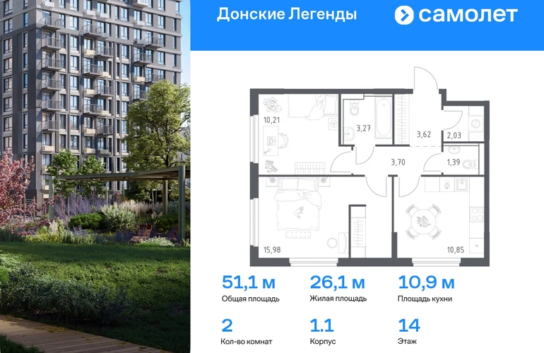 Строим кварталы для жизни с заботой о будущем. Предлагается 2-комнатная квартира комфорт-класса 51,05 кв.м в корпусе 1.1 на 14 этаже, в ЖК «Донские Легенды» Квартира без отделки. Доступность опции «отделка» и возможность комплектации мебелью и декором уточняйте у застройщика. Приобрести квартиру возможно по специальным акциям от застройщика, с текущими условиями акций можно ознакомиться в блоке «Акций». Цена динамическая и может отличаться, уточняйте актуальность у застройщика. Чувствовать гордость, когда любимая команда забивает гол, и с удовольствием спешить на тренировку по мини-футболу или теннису — так выглядит атмосфера в «Квартале Чехова» в Ленинском районе. Здесь каждый день станет ценным экспонатом в вашей коллекции впечатлений. Проект расположен рядом с Восточным шоссе и улицей Пойменной, всего в 10 минутах на машине от центра города. За 3 минуты вы доберетесь до Ворошиловского моста, а за 4 — до Темерницкого. Если не хотите ехать на машине, рядом остановки автобусов. Поблизости находится спортивный комплекс «Гребной канал Дон», а стадион «Ростов Арена» ждет любителей футбола. Прогуляться по благоустроенной набережной, повеселиться в аквапарке и подкрепиться мороженым можно в Левобережном парке — до него 5 минут на такси. Утро начнется с прогулки с малышом до одного из 3 детских садов. Рядом есть школа для ребят постарше, детская школа искусств, центр культурного развития и ФОК. В квартале откроются поликлиника со станцией скорой помощи и 2 торговых центра. Архитектура квартала сочетает современность и изящество. Элегантные французские балконы и панорамные окна позволят наслаждаться великолепными пейзажами. Во дворе дети играют на площадках, а взрослые занимаются спортом. У жителей будет собственный ипподром для соревнований по конкуру. А еще подземный и многоуровневые паркинги на 7,5 тысячи машино-мест. Входы в подъезды расположены на уровне земли, что удобно для родителей с колясками и путешественников. Для будущих жителей — квартиры без отделки. Можно реализовать любые дизайнерские идеи в своем новом доме.#yan19-2r1777253#О застройщике
