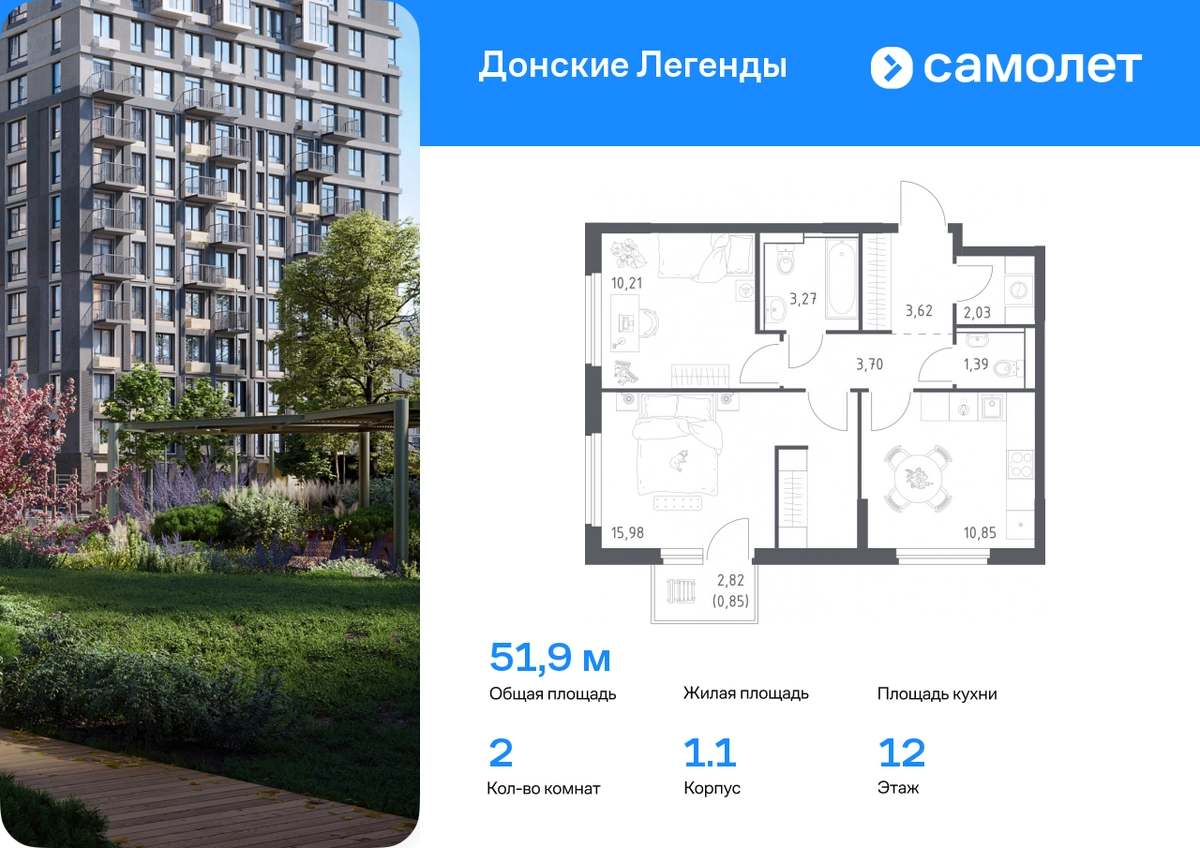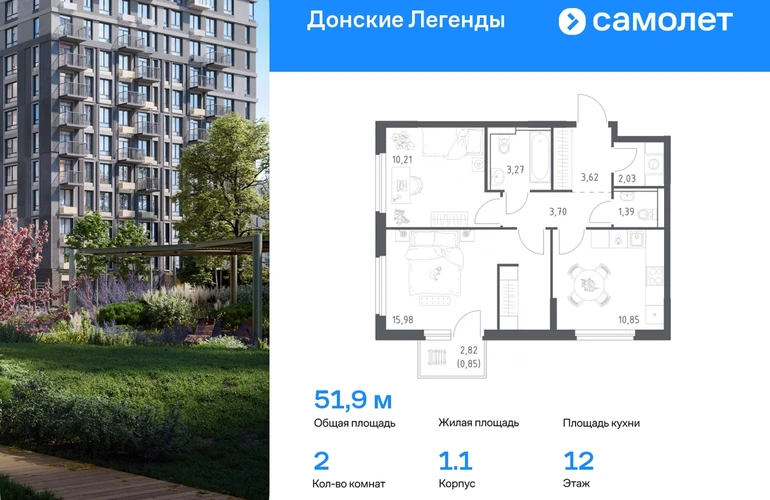 Строим кварталы для жизни с заботой о будущем. Предлагается 2-комнатная квартира комфорт-класса 51,9 кв.м в корпусе 1.1 на 12 этаже, в ЖК «Донские Легенды» Квартира без отделки. Доступность опции «отделка» и возможность комплектации мебелью и декором уточняйте у застройщика. Приобрести квартиру возможно по специальным акциям от застройщика, с текущими условиями акций можно ознакомиться в блоке «Акций». Цена динамическая и может отличаться, уточняйте актуальность у застройщика. Чувствовать гордость, когда любимая команда забивает гол, и с удовольствием спешить на тренировку по мини-футболу или теннису — так выглядит атмосфера в «Квартале Чехова» в Ленинском районе. Здесь каждый день станет ценным экспонатом в вашей коллекции впечатлений. Проект расположен рядом с Восточным шоссе и улицей Пойменной, всего в 10 минутах на машине от центра города. За 3 минуты вы доберетесь до Ворошиловского моста, а за 4 — до Темерницкого. Если не хотите ехать на машине, рядом остановки автобусов. Поблизости находится спортивный комплекс «Гребной канал Дон», а стадион «Ростов Арена» ждет любителей футбола. Прогуляться по благоустроенной набережной, повеселиться в аквапарке и подкрепиться мороженым можно в Левобережном парке — до него 5 минут на такси. Утро начнется с прогулки с малышом до одного из 3 детских садов. Рядом есть школа для ребят постарше, детская школа искусств, центр культурного развития и ФОК. В квартале откроются поликлиника со станцией скорой помощи и 2 торговых центра. Архитектура квартала сочетает современность и изящество. Элегантные французские балконы и панорамные окна позволят наслаждаться великолепными пейзажами. Во дворе дети играют на площадках, а взрослые занимаются спортом. У жителей будет собственный ипподром для соревнований по конкуру. А еще подземный и многоуровневые паркинги на 7,5 тысячи машино-мест. Входы в подъезды расположены на уровне земли, что удобно для родителей с колясками и путешественников. Для будущих жителей — квартиры без отделки. Можно реализовать любые дизайнерские идеи в своем новом доме.#yan19-2r1788823#О застройщике