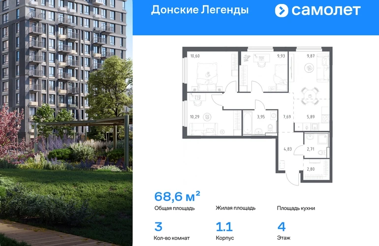 Строим кварталы для жизни с заботой о будущем. Предлагается 3-комнатная квартира комфорт-класса 68,56 кв.м в корпусе 1.1 на 4 этаже, в ЖК «Донские Легенды» Квартира с предчистовой отделкой. Доступность дополнительных опций уточняйте у застройщика. Приобрести квартиру возможно по специальным акциям от застройщика, с текущими условиями акций можно ознакомиться в блоке «Акций». Цена динамическая и может отличаться, уточняйте актуальность у застройщика. Чувствовать гордость, когда любимая команда забивает гол, и с удовольствием спешить на тренировку по мини-футболу или теннису — так выглядит атмосфера в «Квартале Чехова» в Ленинском районе. Здесь каждый день станет ценным экспонатом в вашей коллекции впечатлений. Проект расположен рядом с Восточным шоссе и улицей Пойменной, всего в 10 минутах на машине от центра города. За 3 минуты вы доберетесь до Ворошиловского моста, а за 4 — до Темерницкого. Если не хотите ехать на машине, рядом остановки автобусов. Поблизости находится спортивный комплекс «Гребной канал Дон», а стадион «Ростов Арена» ждет любителей футбола. Прогуляться по благоустроенной набережной, повеселиться в аквапарке и подкрепиться мороженым можно в Левобережном парке — до него 5 минут на такси. Утро начнется с прогулки с малышом до одного из 3 детских садов. Рядом есть школа для ребят постарше, детская школа искусств, центр культурного развития и ФОК. В квартале откроются поликлиника со станцией скорой помощи и 2 торговых центра. Архитектура квартала сочетает современность и изящество. Элегантные французские балконы и панорамные окна позволят наслаждаться великолепными пейзажами. Во дворе дети играют на площадках, а взрослые занимаются спортом. У жителей будет собственный ипподром для соревнований по конкуру. А еще подземный и многоуровневые паркинги на 7,5 тысячи машино-мест. Входы в подъезды расположены на уровне земли, что удобно для родителей с колясками и путешественников. Для будущих жителей — квартиры без отделки. Можно реализовать любые дизайнерские идеи в своем новом доме.#yan19-2r1819630#О застройщике