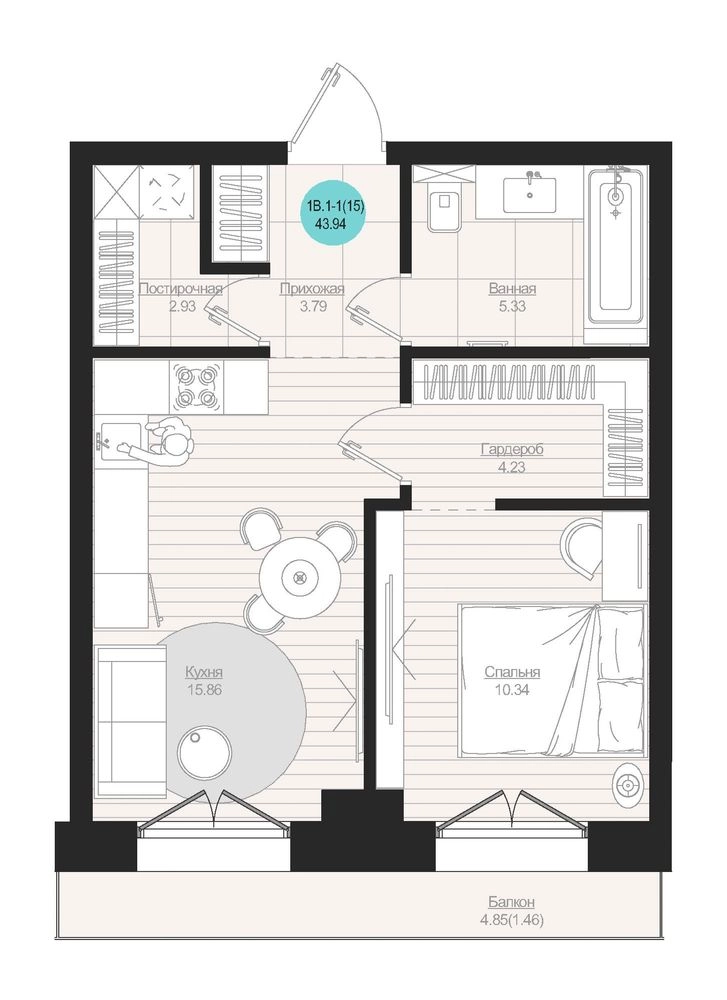 1-ком, 43.94 кв.м., 3/19эт.