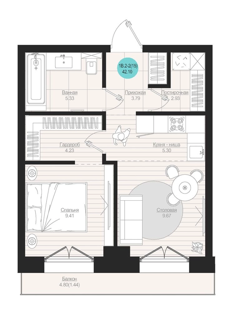 1-ком, 42.1 кв.м., 4/19эт.